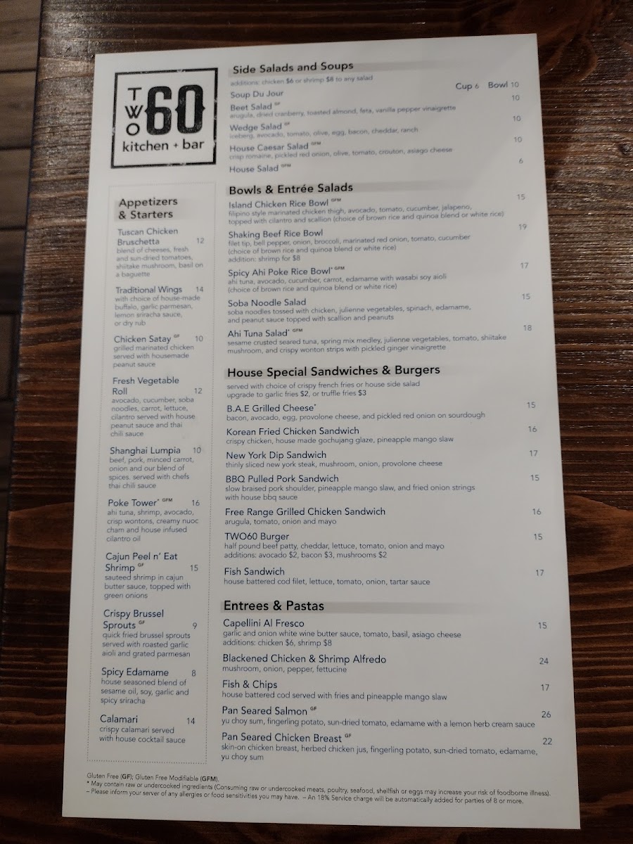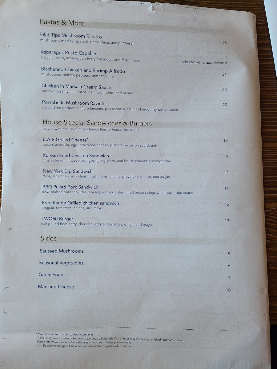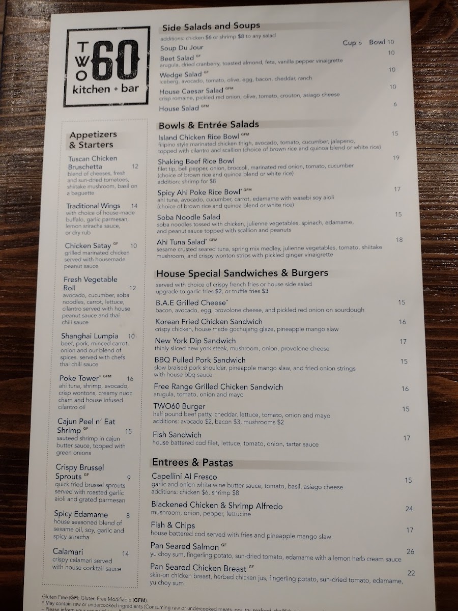 The menu at Two60 Kitchen Bar is a celebration of American flavors with a twist. Start your meal with their Tuscan Bruschetta, which features perfectly toasted baguettes topped with a luscious blend of cheeses, fresh tomatoes, and an aromatic balsamic reduction—an appetizer that not only pleases the eye but tantalizes the taste buds at just $14. For those who crave something with a kick, the Chicken Wings come in a variety of sauce choices, including buffalo and garlic parmesan; they're a tantalizing way to begin your culinary journey here. Don't miss the Chicken Satay with its house-made peanut sauce, offering a unique take on a classic dish at only $12.