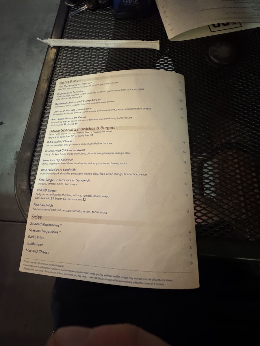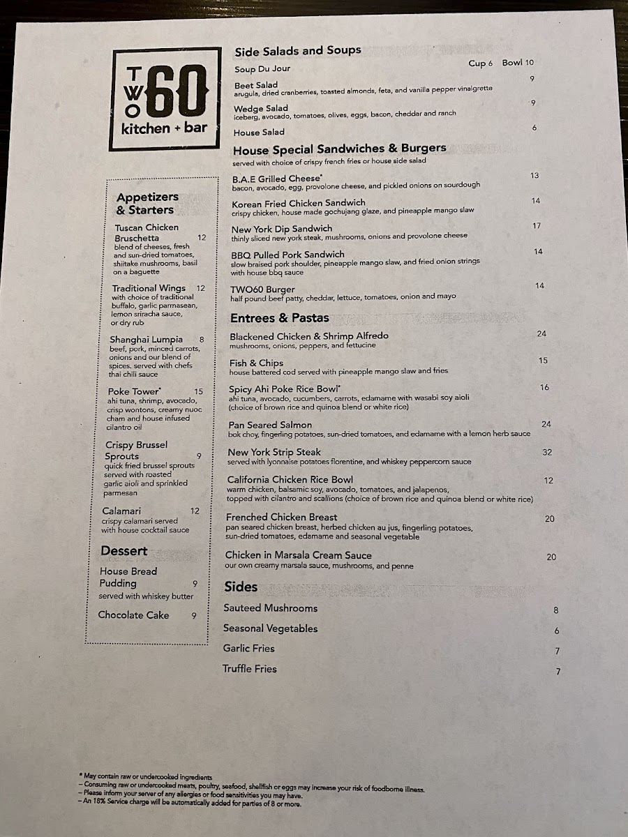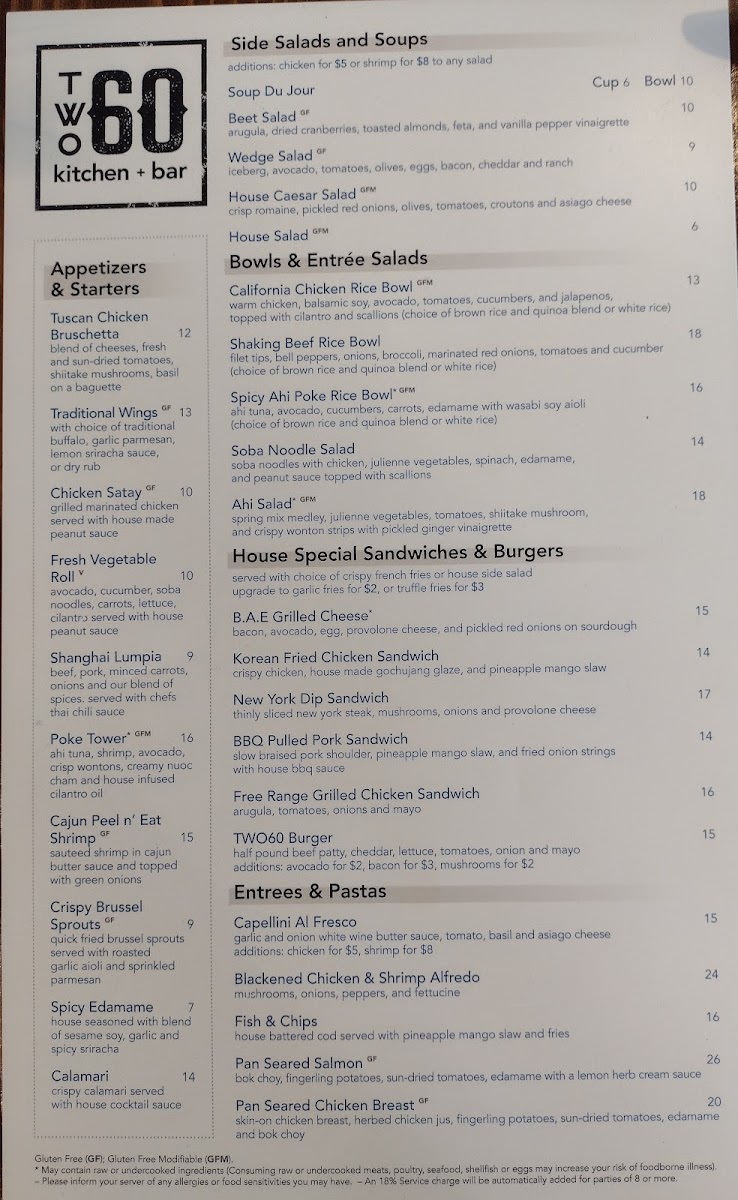 The menu at Two60 Kitchen Bar is a celebration of American flavors with a twist. Start your meal with their Tuscan Bruschetta, which features perfectly toasted baguettes topped with a luscious blend of cheeses, fresh tomatoes, and an aromatic balsamic reduction—an appetizer that not only pleases the eye but tantalizes the taste buds at just $14. For those who crave something with a kick, the Chicken Wings come in a variety of sauce choices, including buffalo and garlic parmesan; they're a tantalizing way to begin your culinary journey here. Don't miss the Chicken Satay with its house-made peanut sauce, offering a unique take on a classic dish at only $12.