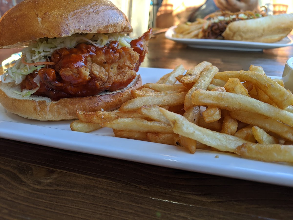 Had a family dinner and sat in their outdoor patio. We had our dog and it’s nice they allow dogs in their patio seatings. We were the only group outside so service didn’t come around as much as we expected. Our server was great at bringing what we needed but could use a little bit more smile. The food was good. We had the Korean Fried Chicken Sandwich (had mango that didn’t taste right in the sandwich), Cheeseburger (cooked as requested in medium rare), New York Dip, Pan Seared Salmon, Ribeye, Brussels Sprouts (very good) and Calamari. Plenty of parking and looks safe.